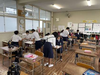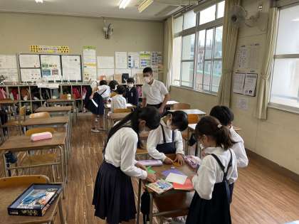 九条南キッズカーニバルに向けたたてわり班活動が始まりました。たてわり班で協力して、自分たちのお店の役割や準備をしています。他の学年の友達だちと話をしながら楽しそうに準備をしています。