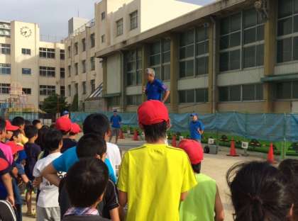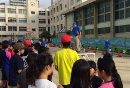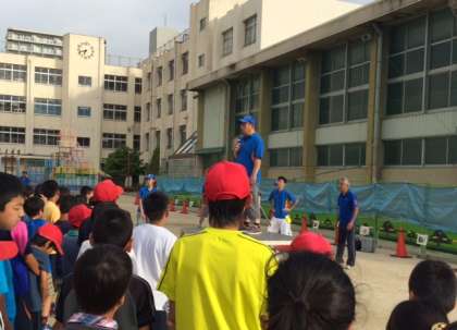ラジオ体操が終わり、九条南連合振興町会会長石谷様、体育厚生協会九条南支部支部長倉橋様、九条南小学校大西校長先生から、夏休みの過ごし方や心構えについてお話をいただきました。