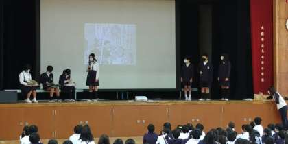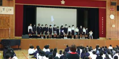図書委員会のメンバーが集会を開き、「読書回転ずし」の取り組みの提案と本の紹介を行いました。ふだん、なかなか本を手に取らない児童もこの機会に様々な本に出あってほしいなと思います。