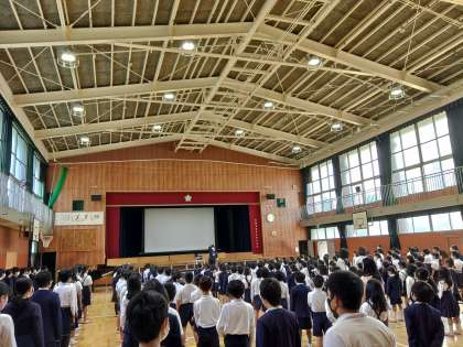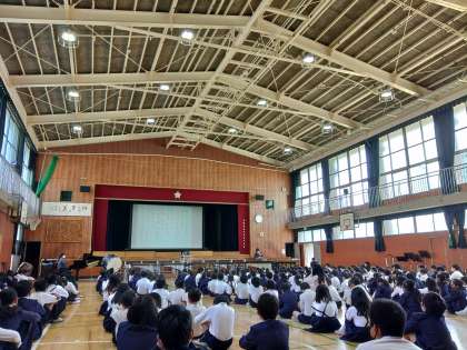 今日の音楽集会では、みんなで校歌の練習をしました。運動会や卒業式など、いつもは2番までしか歌わないのですが、実は、九条南小学校の校歌は3番まであります。歌詞を音読し、少しずつ区切りながら練習した後、1番から3番まで通して歌いました。