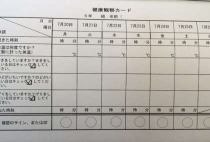 26日(日)登校後すぐに、「健康観察カード」の確認を行います。記入・押印もれがないようにしましょう。
