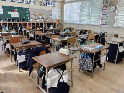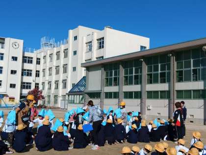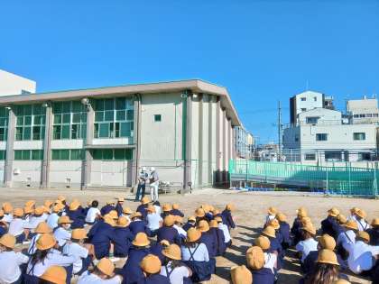 今日は、福音幼稚園の子たちと一緒に、合同避難訓練をしました。地震が起こった後、津波が発生する可能性があるという想定で実施しました。初めに運動場へ避難し、次に4階以上の教室へ避難します。6年生は幼稚園の子とペアになって、音楽室まで避難しました。