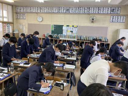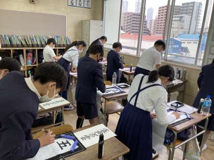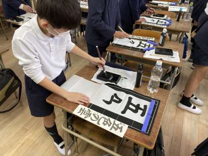 2023年の書初めとして、書道総研の小学校5年生の課題である「五色の雲」の書初めをしました。これまでに学習してきた「書写のカギ」を意識しながら、一画ずつ丁寧に、そして力強く書いていきました。