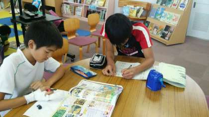 今日もたくさんの子どもたちが読書を楽しみに図書室にやってきました。夏休みの課題に取り組む子どもたちも大勢いました。