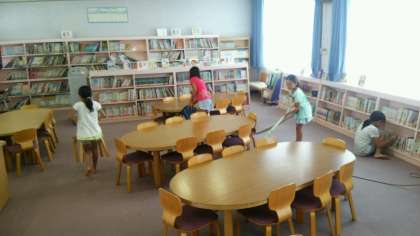 昨日で夏休み図書館開放は終わりました。最終日のため、図書室の開放時間をいつもより少し早めに切り上げました。みんなが帰った後、図書委員会の子どもたちは図書室の片づけ、掃除、本の整理整頓をしました。倒れている本をお越したり、シリーズの本を番号順に並べたりとがんばりました。最後まで丁寧に仕事をしている姿が光っていました。