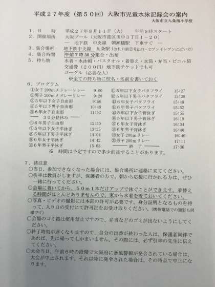 特別練習に向けて、「大阪市児童水泳記録会の案内」を再度アップします。