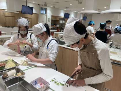 「考える防災教室」の後は、エコクッキング(調理実習)を行いました。環境のことを考え、食品をむだにしない調理や、水道やガスを使いすぎない工夫をグループで協力して行いました。ごはんやみそ汁、野菜炒めを作りましたので、お家でも一緒に作ってみてください。