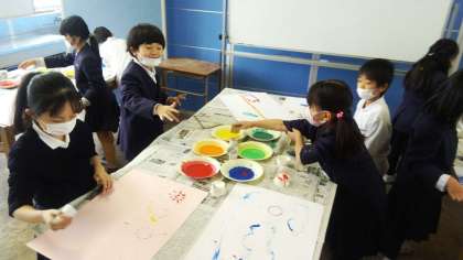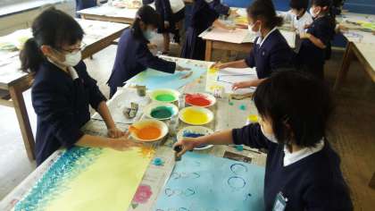 絵具を使って、スタンピング。ヨーグルトカップやトイレットペーパーの芯、段ボールの側面等を使って、いろいろな形を楽しみました。スタンピングしたあとに、どんな世界ができるのかな?思い思いにパスを加えて、仕上げていました。