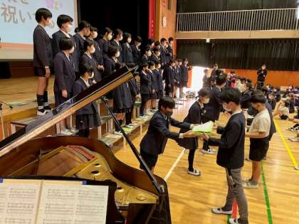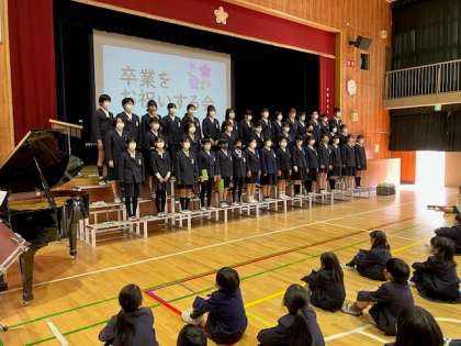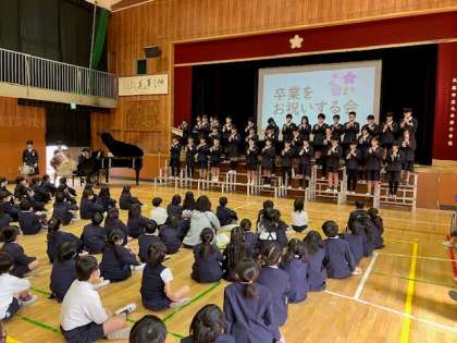 そして最後は、6年生によるお別れの言葉です。呼びかけと合唱と合奏をしました。6年生の一生懸命な発表を聞き、涙が出てくる児童もいました。6年生も、在校生に向けた最後発表をしっかりとすることができました。家庭科で手作りをしたぞうきんもプレゼントをしました。