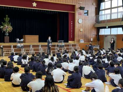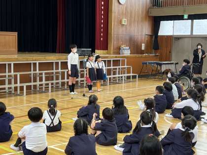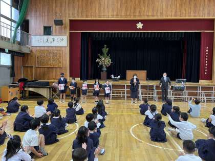 作文発表では1年生と5年生の代表児童が1年間の振り返りと次年度の抱負を発表しました。1年生の児童は「思い出」について、5年生の児童は「様々な学校行事から学んだこと」を堂々と発表していました。全校児童から大きな拍手が送られました。
