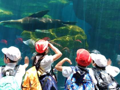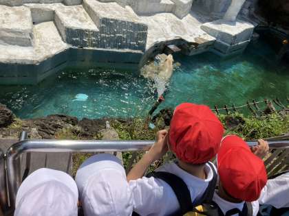 4月25日が雨で延期になったので、今回、4月26日からオープンした新しい展示を見ることができました。ペンギンやアシカが水中を泳ぐ様子が見られます。目の前をペンギンやアシカが通ると、わあっと歓声が上がりました。シロクマのホウちゃんも元気いっぱい。しぶきを上げて水に飛び込む姿に、子どもたちの笑顔が弾けました。