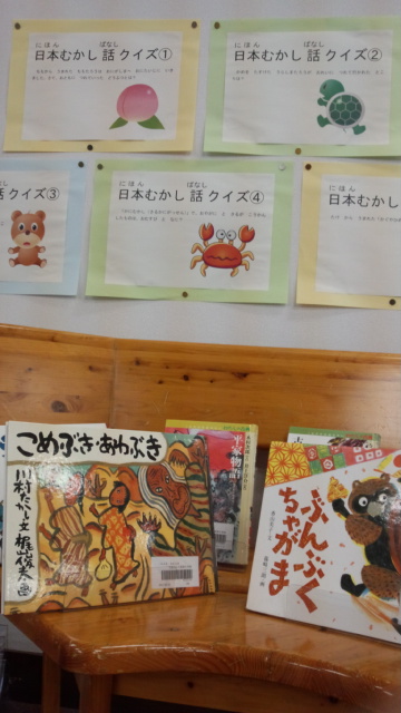 そこで図書室に「日本むかし話」のコーナーを作りました。合わせて「日本むかし話クイズ」も貼ってありますので、この機会にぜひ読み親しんでほしいものです。