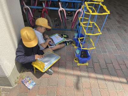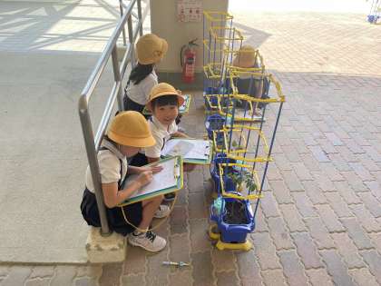 自分で植えたミニトマトの様子を観察カードに書きとめました。色・形や葉の数・大きさ、においや手触りまで、観察したことを記録し、違いを見つけていこうと目が光っています。