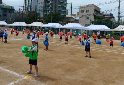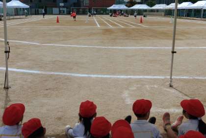 運動会を間近にひかえ、2年生とリハーサルをしました。本番と同じように、2年生と交代で競技や演技をしていきます。自分たちの出番を終えると、テントの下で2年生のがんばりを応援しました。