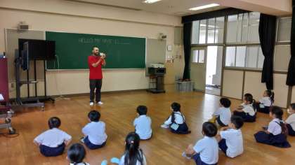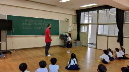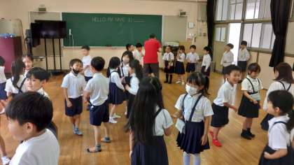 今年度のC-NETのシェーン先生と、初めての外国語活動を行いました。この日は、自己紹介の仕方を練習しました。シェーン先生の発音をまねしながら、言い方を覚えた後、友だちとペアを作って、お互いに自己紹介をしました。初めての活動でしたが、笑顔がいっぱいの1時間となりました。