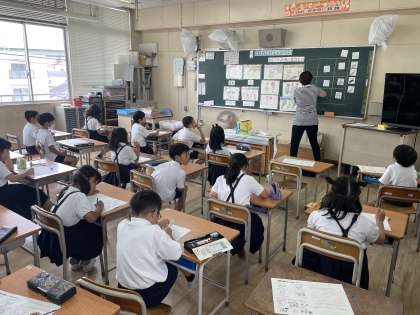 九条東小学校から栄養教諭に来ていただき授業をしていただきました。カルシウムをとることの良さを紙芝居で教えていただき、カルシウムの多い食べ物をたくさん教えていただきました。