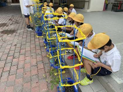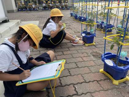 いつの間にか大きく育ってきているミニトマト、観察し花や実をみつけました。色や形、大きさ、数、におい様々な観点で前とどのように変わったか研究する博士の目線で観察しました。