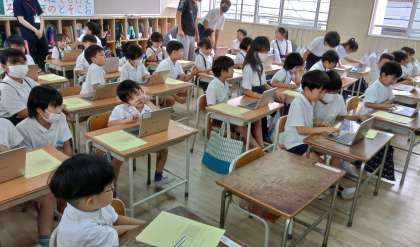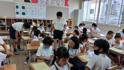 初めてタブレットを使う1年生のために、6年生が助けに来てくれました。IDやパスワードの入力、シャットダウンの仕方など、覚えることがたくさんありましたが、6年生のおかげで、1年生も自分でできるようになりました。