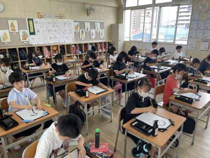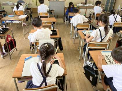 初めての毛筆の授業では、習字道具の名前や使い方を学びました。この日は曲線や直線などを書きました。最初は緊張した面持ちだった子どもたちも、上手く書けると笑顔になっていました。