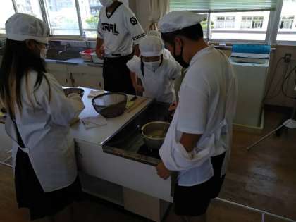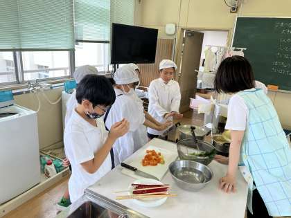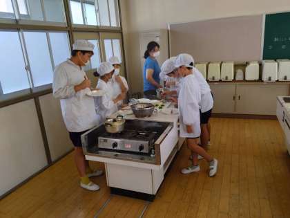 家庭科室の使い方や、ガスコンロの扱い方、包丁の安全な扱い方などを学習してきていよいよ本番の調理です。今回はゆでる調理の学習です。小松菜とじゃがいも、人参を茹でて塩コショウや醬油で味付けしました。グループで手際よく調理や片づけを進めて完成しました。そしてグループごとでいただきました。「おいしい!」といった声や「苦労した甲斐があった。」という声も聞かれました。