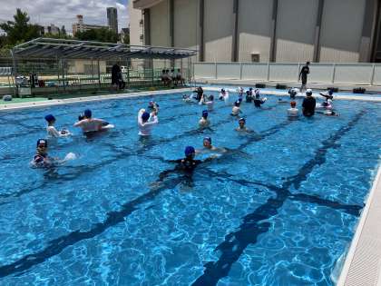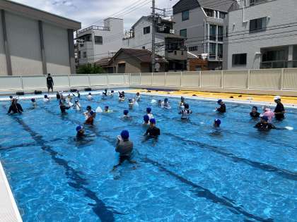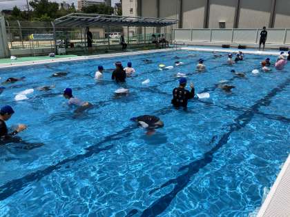 水泳の時間にもしもの水難事故に備えて、着衣泳の学習を行いました。水着のときとの違いを実際に感じながら、水の中で歩いたり泳いだりしました。泳ぐことの難しさを実感した後は、ビニール袋を使って長い時間浮くことができるように工夫しました。