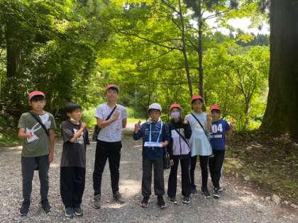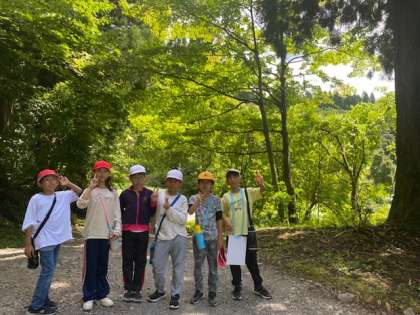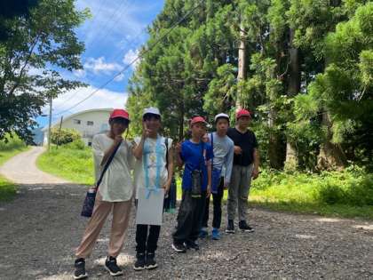 宿舎の周辺を活動班で散策しました。豊かな自然を五感を鋭くして、感じ取ってポイントを巡り楽しく活動しました。生き物の声や足跡、動植物の生態に深く触れ合うことができました。