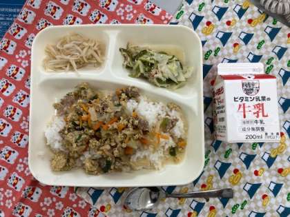 15日(金)他人丼、ささみと野菜のいためもの、もやしの甘酢あえ、ごはん、牛乳