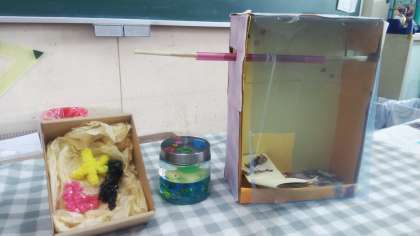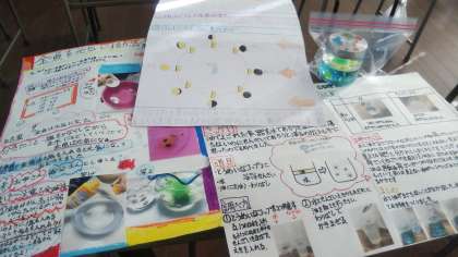 中学年や高学年の教室や廊下、玄関には、夏の自由研究が掲示されています。料理、星や月の観察、物作り、虫の観察、などなど。それぞれが興味のあること、疑問に思っていることについて調べて取り組みました。