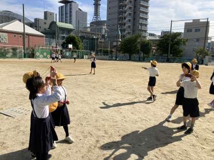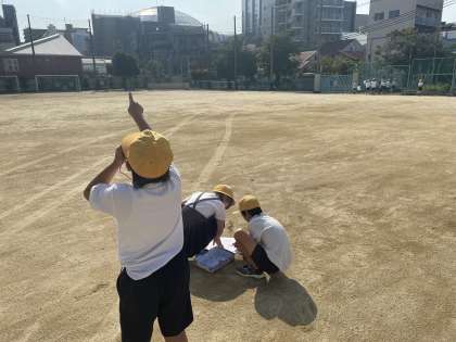 3年生は理科で「かげと太陽」について学習しています。太陽の反対側に影ができることを遮光板を使って観察しました。また、時間によって影ができる場所が違うことについても観察しました。午前・正午・午後の3回観察し、太陽の位置が変わるから影の場所も変わるということに気づくことができました。班で協力して、楽しく学習していました。