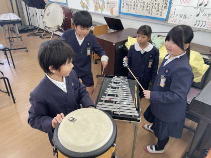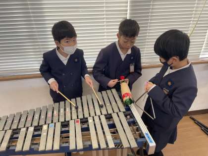 3年生は音楽で、「おかしのすきな まほう使い」という曲でまほうの音楽づくりをしています。いろいろな楽器の音を聞いてみて、班ごとにまほうの音楽を作っています。どの班も話をしながら素敵な音楽を作っていました。