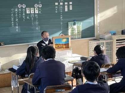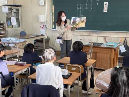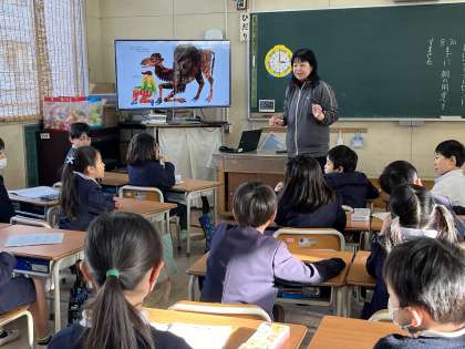 教員による読み聞かせ「わくわくお話プレゼント」がありました。毎月1回教員が各クラスをローテーションしながら、様々なジャンルの本を読み聞かせをしています。どの教室でも子どもたちが静かにお話の世界に浸っていました。校長先生は6年生の教室で紙芝居を読んでくださいました。
