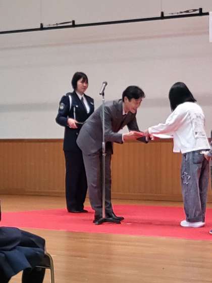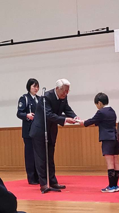 第22回交通安全コンテスト表彰式が大阪府警本部で行われました。大阪府下の小学生約9700人の応募の中から、本校では中学年の部で1人、高学年の部で1人が受賞しました。名前を呼ばれると「はい」と返事をし、少し緊張した面持ちで壇上に上がりました。大きな表彰状と盾をもらい、とても誇らしげな様子でした。