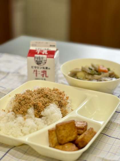本日から給食が始まりました。今日の献立は、鶏肉とじゃがいもの煮もの・あつあげのしょうゆだれかけ・紅さけそぼろ・白ご飯・牛乳でした。