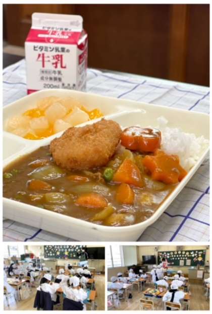 今日の献立は、カツカレーライス・フルーツゼリー・牛乳です。1年生の入学をお祝いする【入学お祝い献立】です。1年生の子どもたちも大喜び。
