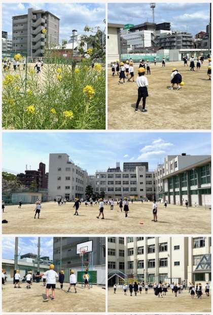 昼休みに運動場に行ってみると、たくさんの子どもたちが元気に遊んでいました。菜の花も桜も咲いて、気持ちの良い春日和です。