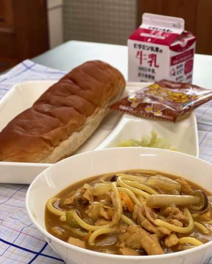 今日の献立は、パン・牛乳・カレースープスパゲッティ・キャベツのピクルス・おさつチップスです。