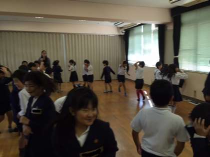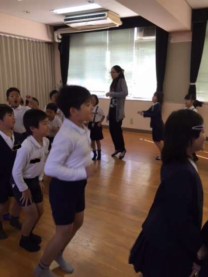 音楽に乗って英語の指示にあわせて体を動かしたり、