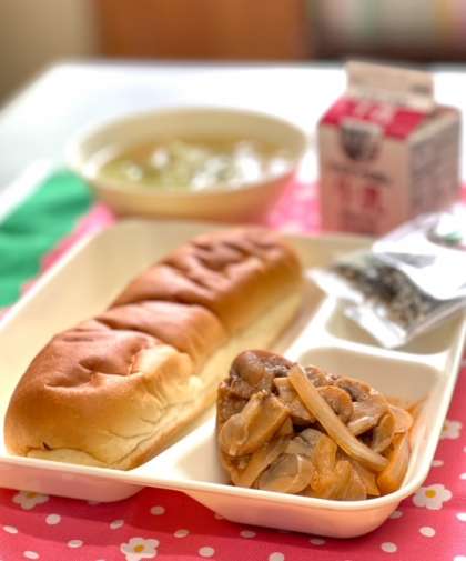今日の献立は、おさつパン、牛乳、煮こみハンバーグ、野菜スープ、ミニフィッシュです。