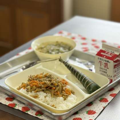 今日の給食は、「こどもの日の行事献立」でした。メニューは、きんぴらちらし、きざみのり、すまし汁、ちまきでした。