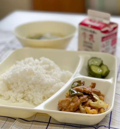 今日の献立は、ごはん、牛乳、ホイコウロー、中華スープ、きゅうりのピリ辛あえです。