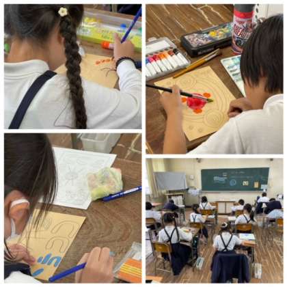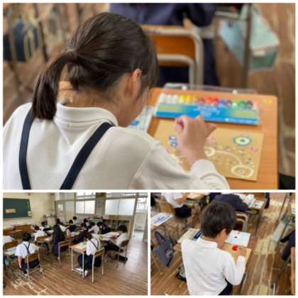 4年生は図工の時間に、塗りと点描を組み合わせた作品に取り組んでいました。最初に絵の具でおおまかに色塗りを行い、その後、目立たせたいところに点描を加えます。綿棒で絵の具をトントンと付けていく感じで絵を描きますが、筆を使うよりも子どもたちは意図したデザインが思い通りにできる様子が楽しいのか、とても集中して取り組んでいました。