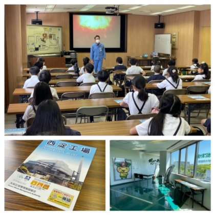 見学前に、会議室でごみの焼却について説明を聞いています。焼却後の灰も利用されており、万博会場となる埋立地にも使われていることや、焼却時の熱を発電などに利用していることを知りました。