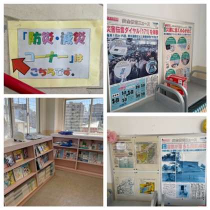 九条南小学校では、図書室の奥に「防災・減災コーナー」を設けています。防災・減災関連の図書の他、防災グッズの展示も行っています。