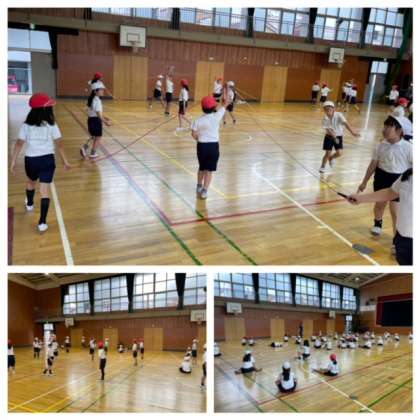 3年生は、なわとびの縄を使った団体演技の練習に取り組んでいます。なわとびは、隣との間隔を広く取りたいので、早く流れを覚えて運動場で練習したいですね。