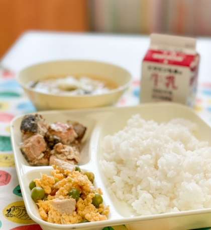 今日の献立は、ごはん、牛乳、さけのごまみそ焼き、五目汁、えんどうの卵とじです。