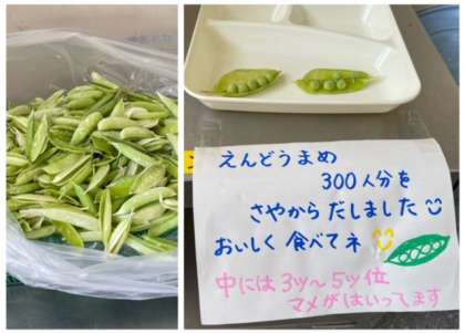 えんどうの卵とじは、大量のえんどう豆を使用。さやから一粒一粒取り出しています。
