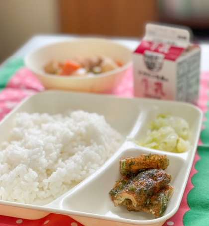 今日の献立は、ごはん、牛乳、ちくわのいそべあげ、あつあげとさといものみそ煮、あっさりキャベツです。