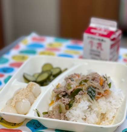 今日の献立は、豚丼、きゅうりの梅風味、白玉だんご、きな粉、牛乳です。