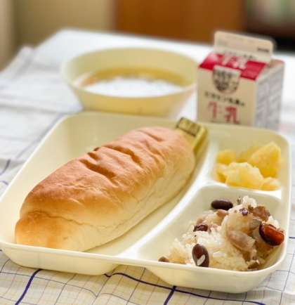 今日の献立は、コッペパン、牛乳、金時豆の中華おこわ、中華スープ、パインアップル(カット缶)、バターです。