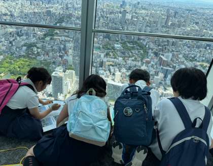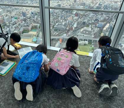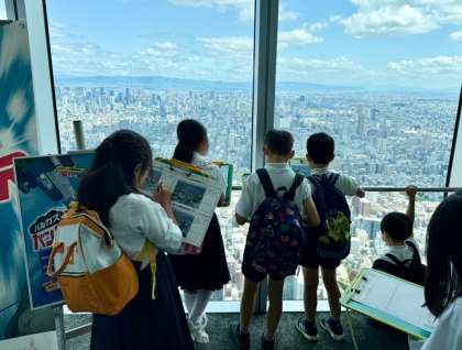 展望台では、「西は大阪湾が見える」「北は高いビルが多い」「マンションがたくさんある」など、私たちの住んでいる大阪についてたくさんの気づきがありました。初めての班行動でしたが、どの班も協力して見学していました。